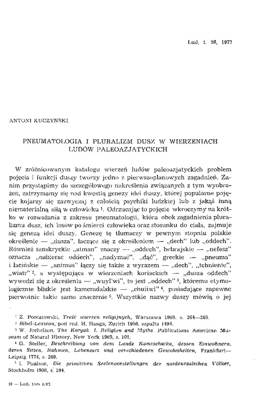 - Pneumatologia i pluralizm w wierzeniach ludów paeloazjatyckich / LUD 1972 t.56