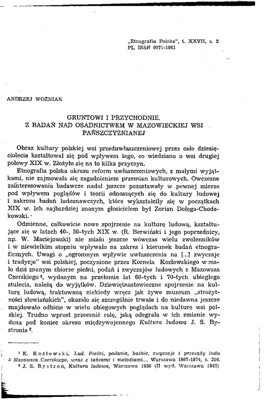 Gruntowi i przychodnie. Z badań nad osadnictwem w mazowieckiej wsi pańszczyźnianej / ETNOGRAFIA POLSKA 1983 t.27 z.2