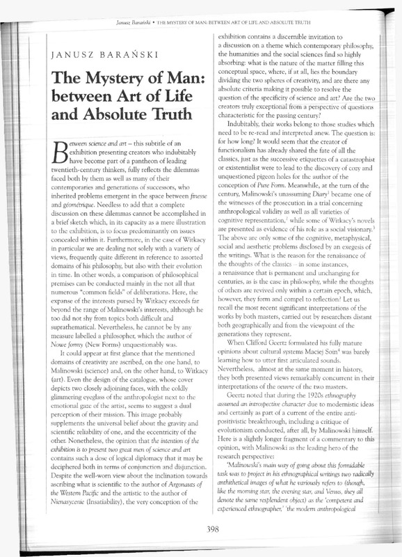 The Mystery of Man: between Art of Life and Absolute Truth=Malinowski i Witkacy: między sztuką życia a prawdą absolutną / Polska Sztuka Ludowa - Konteksty 2000 t.54 z.1-4