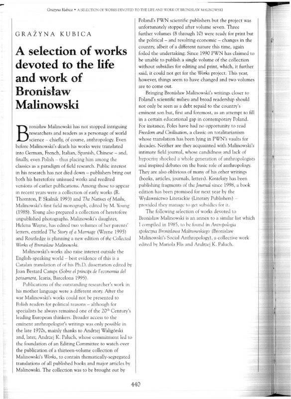 A selection of works devoted to the life and work of Bronisław Malinowski=Wybór prac poświęconych życiu i twórczości Bronisława Malinowskiego / Polska Sztuka Ludowa - Konteksty 2000 t.54 z.1-4