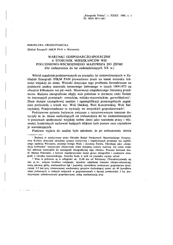 Warunki gospodarczo-społeczne a stosunek mieszkańców wsi południowo-wschodniego Mazowsza do ziemi (od uwłaszczenia do lat siedemdziesiątych XX w.) / ETNOGRAFIA POLSKA 1988 t.32 z.1