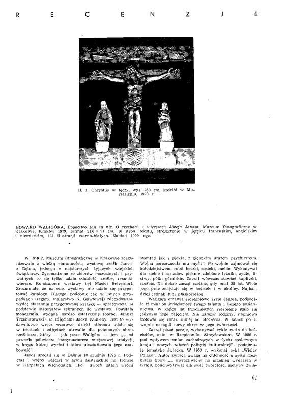 Recenzje; Edward Waligóra, "Bogactwo jest tu nic. O rzeźbach i wierszach Józefa Janosa" / Polska Sztuka Ludowa - Konteksty 1980 t.34 z.1