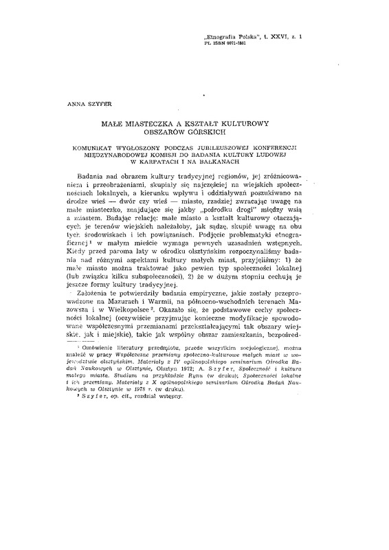 Małe miasteczka a kształt kulturowy obszarów górskich / ETNOGRAFIA POLSKA 1982 t.26 z.1