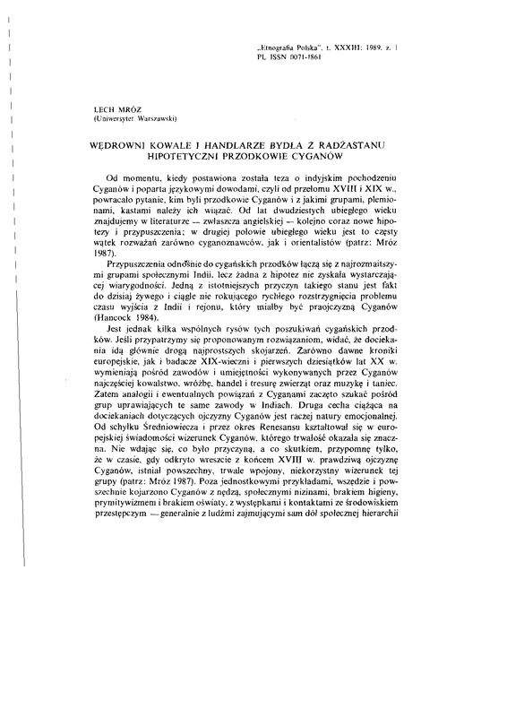 Wedrowni kowale i handlarze bydła z Radżastanu - hipotetyczni przodkowie Cyganów / ETNOGRAFIA POLSKA 1989 t.33 z.1