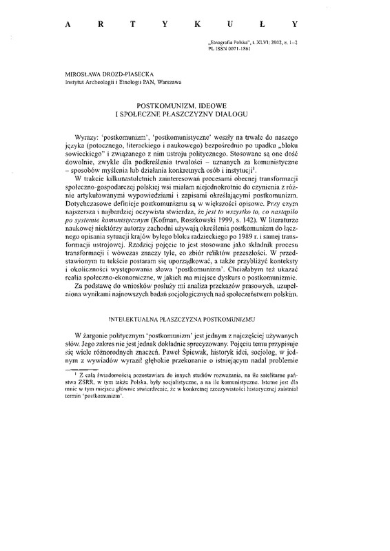 Postkomunizm. Ideowe i społeczne płaszczyzny dialogu / ETNOGRAFIA POLSKA 2002 t.46