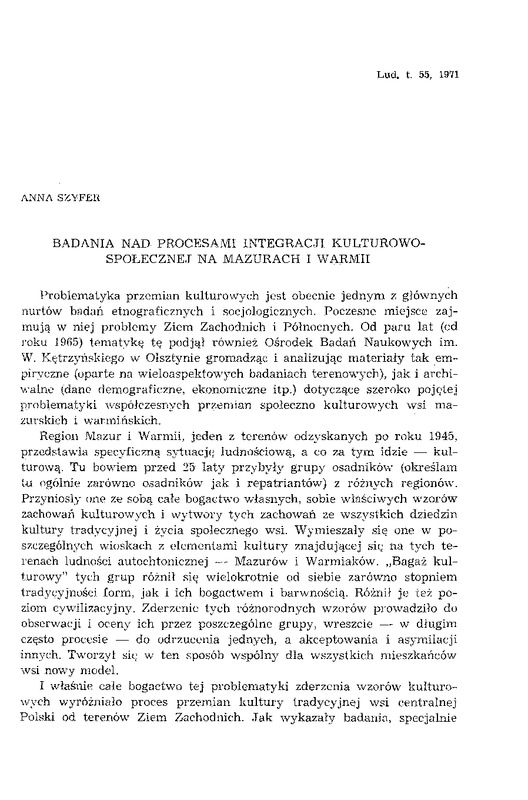 - Badania nad procesami integracji kulturowo-społecznej na Mazurach i Warmii / LUD 1971 t. 55