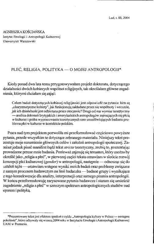 Płeć, religia,polityka - o mojej antropologii / LUD 2004 t.88