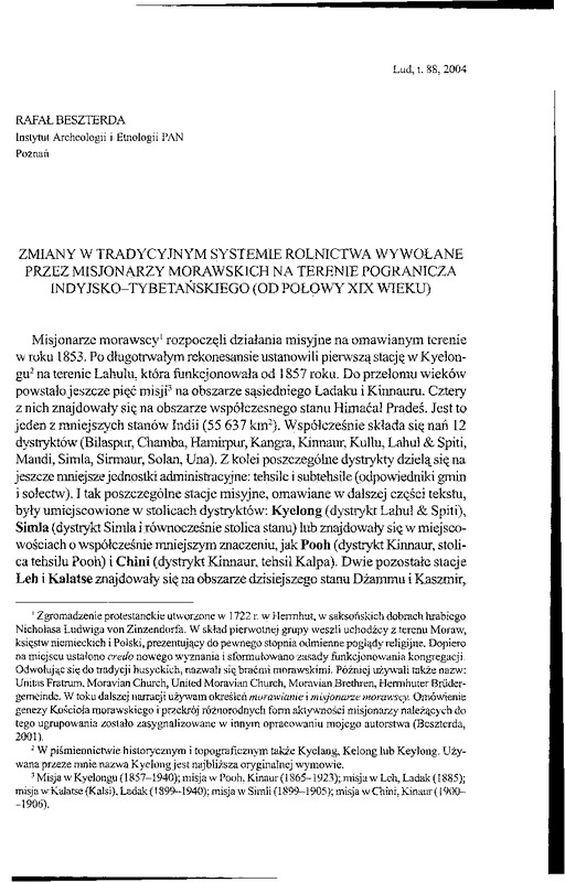 Zmiany w tradycyjnym systemie rolnictwa wywołane przez misjonarzy morawskich na terenie pogranicza indyjsko-tybetańskiego ( od połowy XIX wieku) / LUD 2004 t.88