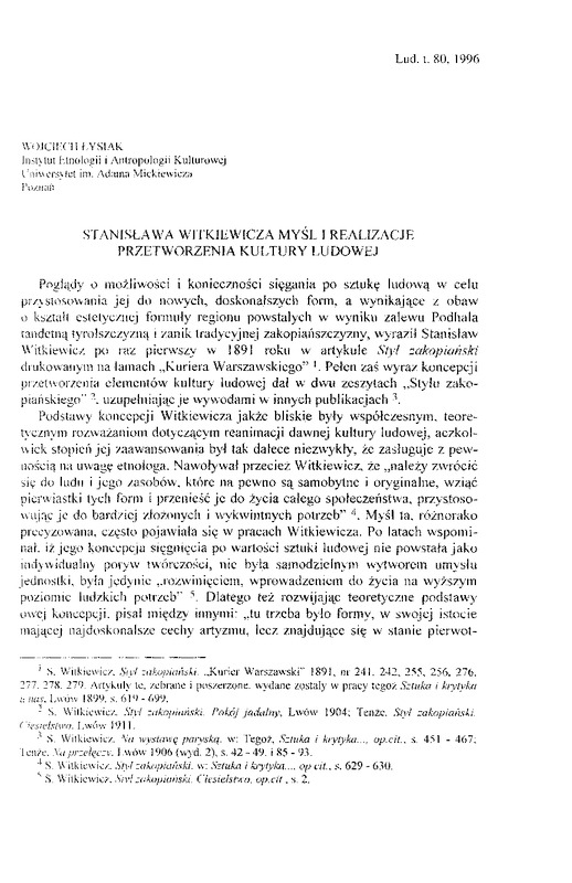 Stanisława Witkiewicza myśl i realizacje przetworzenia kultury ludowej / LUD 1996 t.80