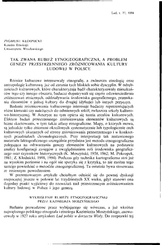 Tak zwana rubież etnograficzna a problem genezy przestrzennego zróżnicowania kultury ludowej w Polsce / LUD 1994 t.77