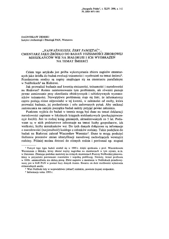 Najważniejsze, żeby pamiętać... Cmentarz jako źródło do badań tożsamości zbiorowej mieszkańców wsi na Białorusi i ich wyobrażeń na temat śmierci / ETNOGRAFIA POLSKA 2000 t.44