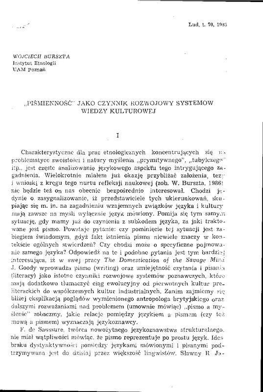 Piśmienność jako czynnik rozwojowy wiedzy kulturowej / LUD 1986 t.70
