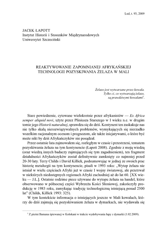 Reaktywowanie zapomnianej afrykańskiej technologii pozyskiwania żelaza w Mali / LUD 2009 t.93