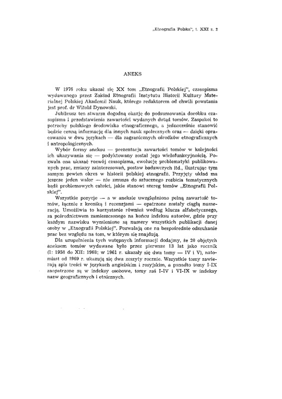 - Aneks: Spis treści "Etnografii Polskiej" I-XX: 1958-1976 / ETNOGRAFIA POLSKA 1977 t.21 z.2