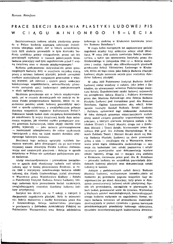 Prace w Sekcji Badania Plastyki Ludowej w ciągu minionego XV-lecia / Polska Sztuka Ludowa - Konteksty 1959 t.13 z.4