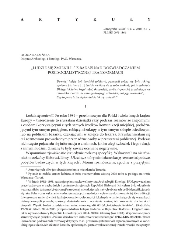 Ludzie się zmienili...Z badań nad doświadczeniem postsocjalistycznej transformacji / ETNOGRAFIA POLSKA 2010 t.54 z.1-2