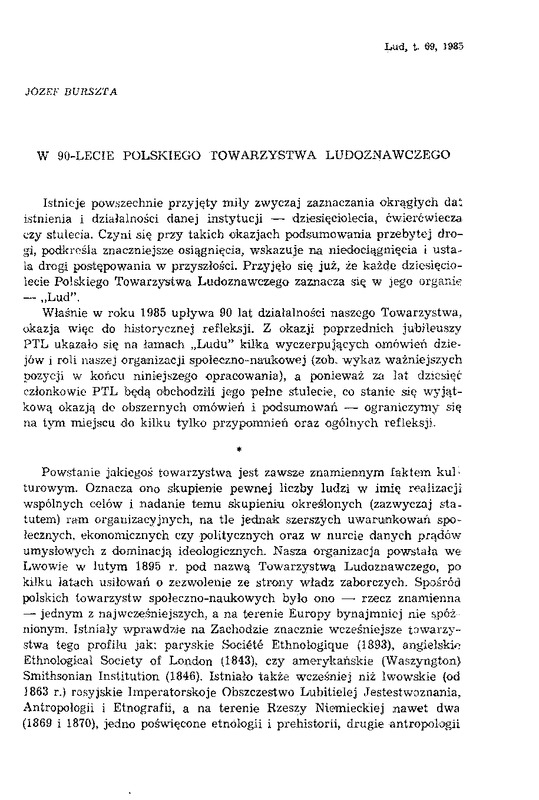- W 90-lecie Polskiego Towarzystwa Ludoznawczego / LUD 1985 t.69
