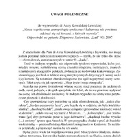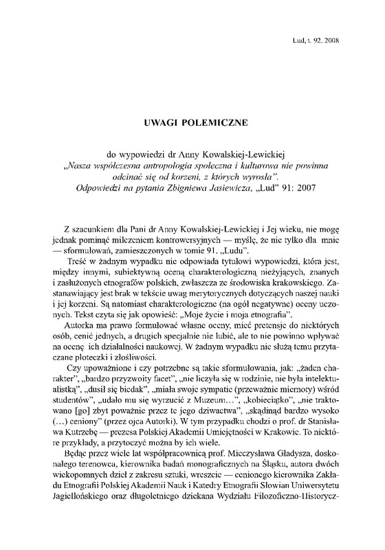 Uwagi polemiczne do wypowiedzi dr Anny Kowalskiej-Lewickiej "Nasza wspólna nowoczesna antropologia społeczna i kulturowa nie powinna odcinać się od korzeni, z których wyrosła" / LUD 2008 t.92