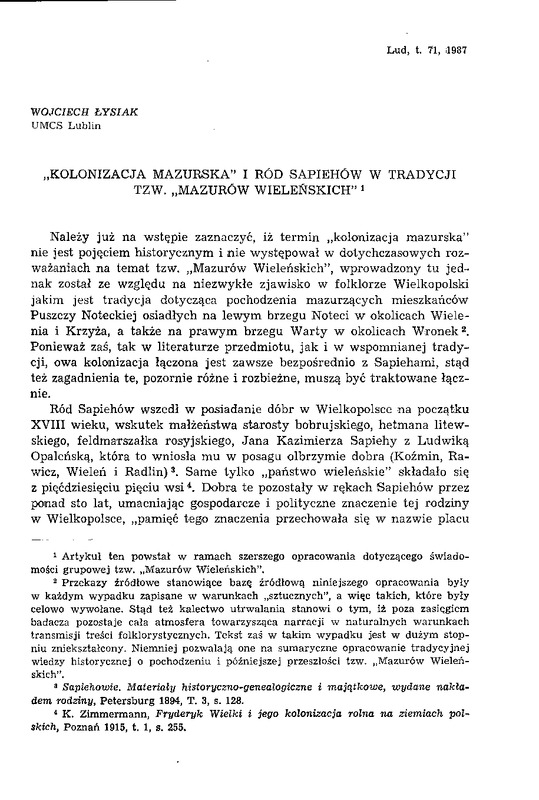 Kolonizacja mazurska i ród Sapiehów w tradycji tzw."Mazurów Wieleńskich" / LUD 1987 t.71