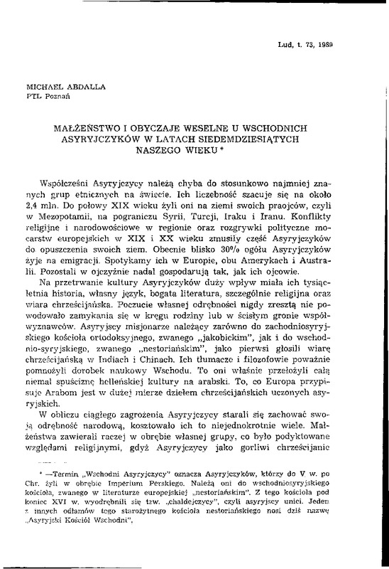 Małżeństwo i obyczaje weselne u wschodnich Asyryjczyków w latach siedemdziesiątych naszego wieku / LUD 1989-90 t.73