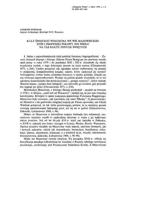 Kult świętego Wojciecha we wsi mazowieckiej XVIII i pierwszej połowy XIX wieku na tle kultu innych świętych / ETNOGRAFIA POLSKA 1998 t.42