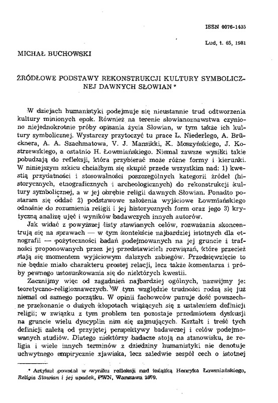 Żródłowe podstawy rekonstrukcji kultury symbolicznej dawnych Słowian / LUD 1981 t.65