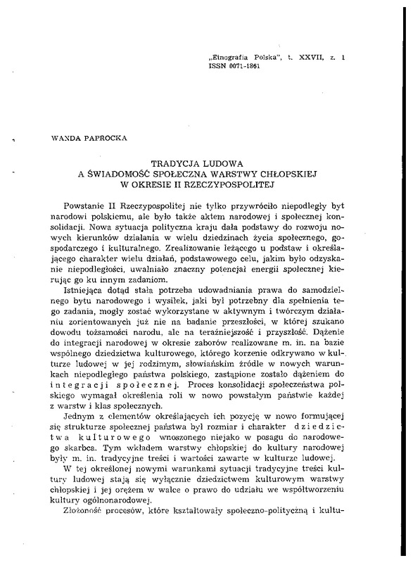 Tradycja ludowa a świadomość społeczna warstwy chłopskiej w okresie II Rzeczypospolitej / ETNOGRAFIA POLSKA 1983 t.27 z.1