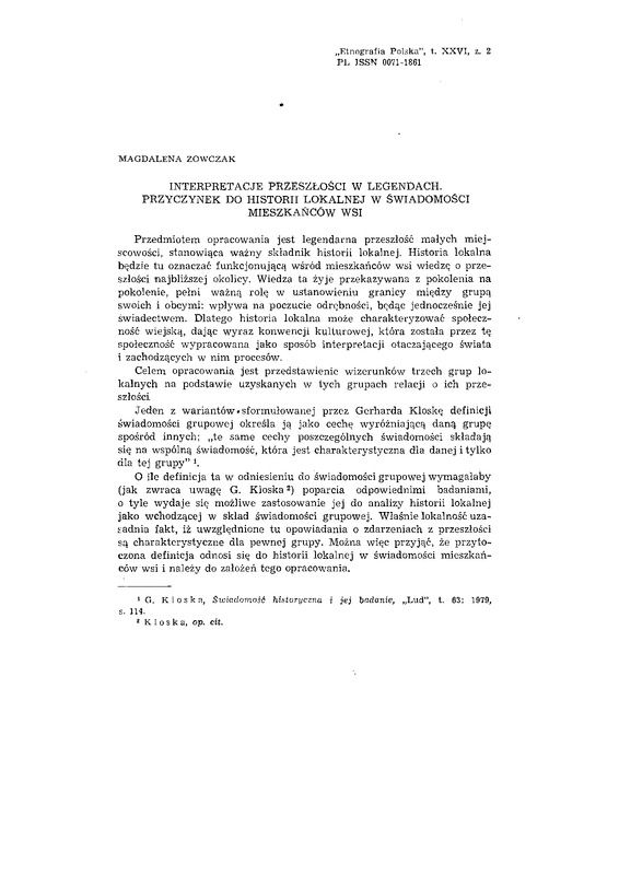 Interpretacje przeszłości w legendach. Przyczynek do historii lokalnej w świadomości mieszkańców wsi / ETNOGRAFIA POLSKA 1982 t.26 z.2