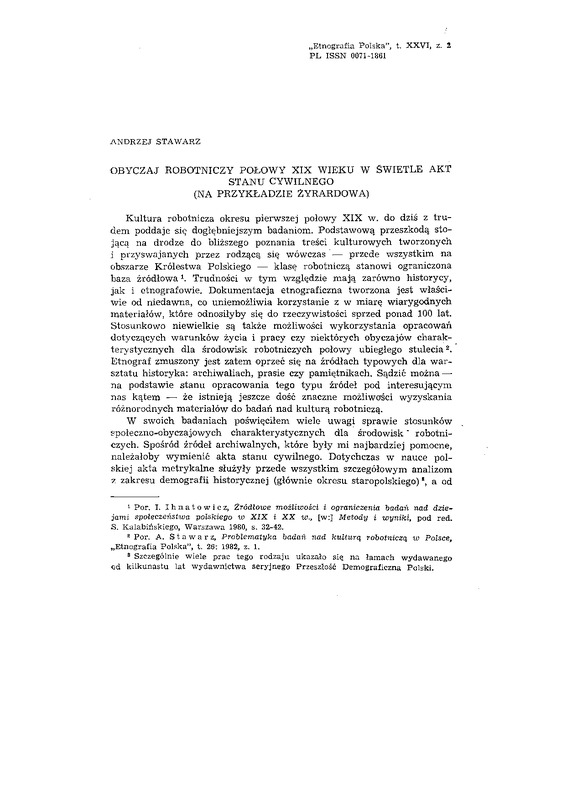 Obyczaj robotniczy połowy XIX w. w świetle akt stanu cywilnego (na przykładzie Żyrardowa) / ETNOGRAFIA POLSKA 1982 t.26 z.2