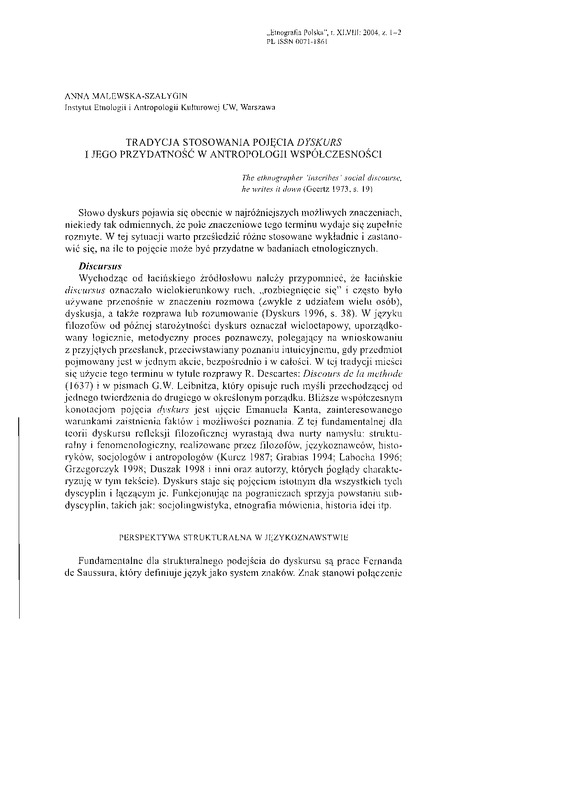 Tradycja stosowania pojęcia "dyskurs" i jego przydatność w antropologii współczesności / ETNOGRAFIA POLSKA 2004 t.48
