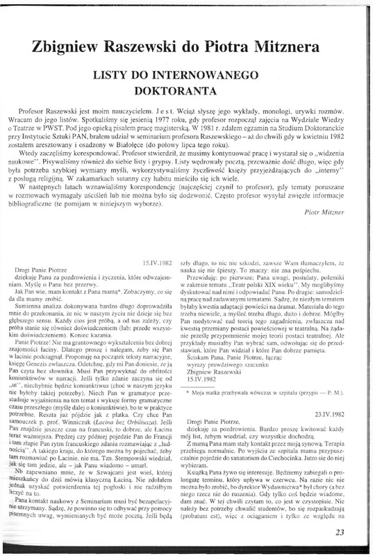 Zbigniew Raszewski do Piotra Mitznera. Listy do internowanego doktoranta / Polska Sztuka Ludowa - Konteksty 1996 t.50 z.1-2