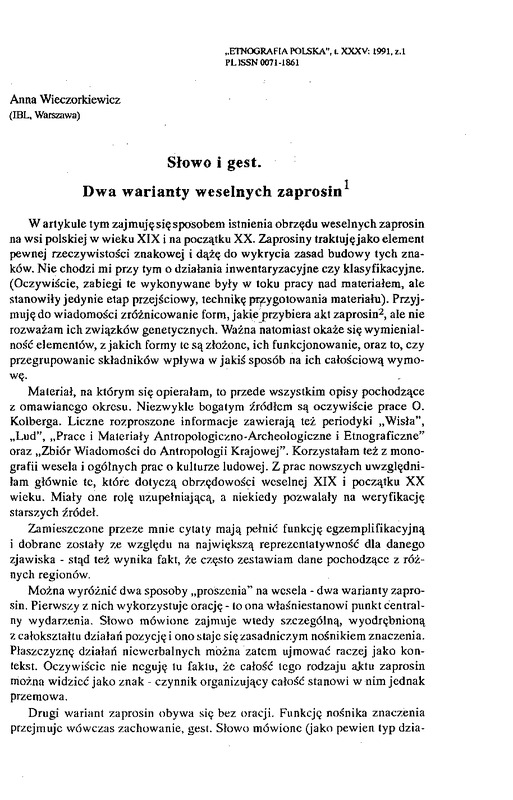 Słowo i gest. Dwa warianty weselnych zaprosin / ETNOGRAFIA POLSKA 1991 t.35 z.1