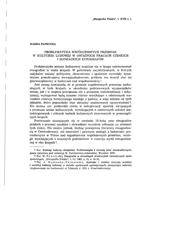 Problematyka współczesnych przemian w kulturze ludowej w ostatnich pracach czeskich i słowackich etnografów / ETNOGRAFIA POLSKA 1973 t.17 z.1