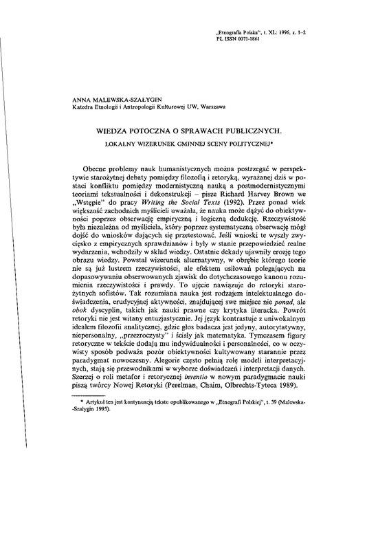 Wiedza potoczna o sprawach publicznych. Lokalny wizerunek gminnej sceny politycznej / ETNOGRAFIA POLSKA 1996 t.40