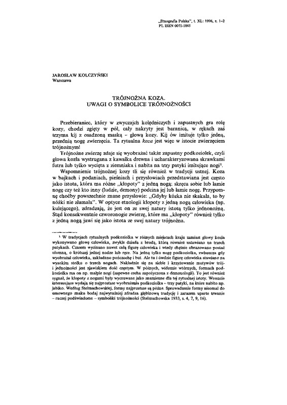 Trójnożna koza. Uwagi o symbolice trójnożności / ETNOGRAFIA POLSKA 1996 t.40