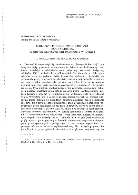 Społeczne funkcje sztuki ludowej. Sztuka ludowa w ocenie współczesnej młodzieży wiejskiej / ETNOGRAFIA POLSKA 1986 t.30 z.1