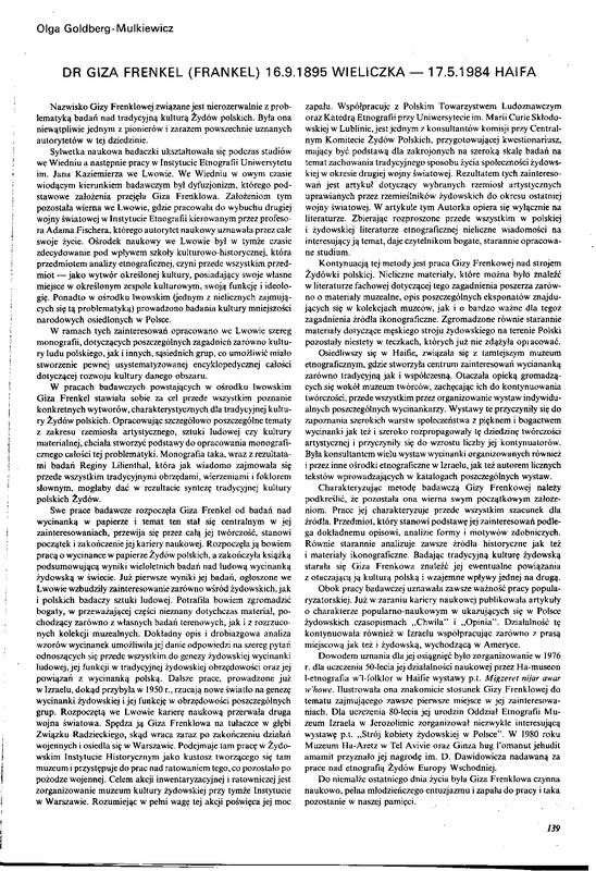 Wspomnienie pośmiertne: Giza Frenkel (Frankel) - 16.09.1895 Wieliczka - 17.05.1984 Haifa / Polska Sztuka Ludowa - Konteksty 1989 t.43 z.1-2