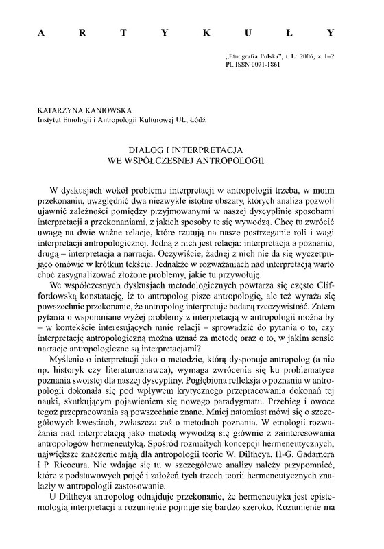 - Dialog i interpretacja we współczesnej antropologii / ETNOGRAFIA POLSKA 2006 t.50