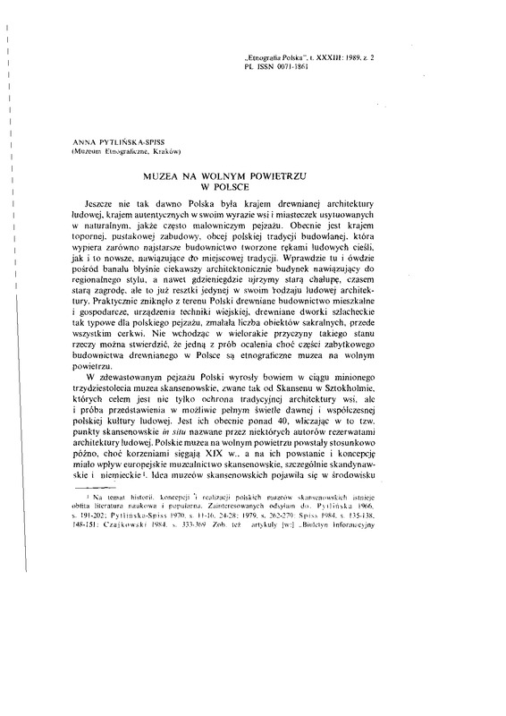 - Muzea na wolnym powietrzu w Polsce / ETNOGRAFIA POLSKA 1989 t.33 z.2