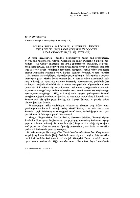 Matka Boska w polskiej kulturze ludowej XIX i XX w. Wybrane kwestie źródłowe i zarysowujące się pytania / ETNOGRAFIA POLSKA 1988 t.32 z.1