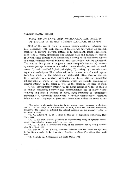 Some theoretical and methodological aspects of studies in human communication behavior / ETNOGRAFIA POLSKA 1975 t.19 z.2