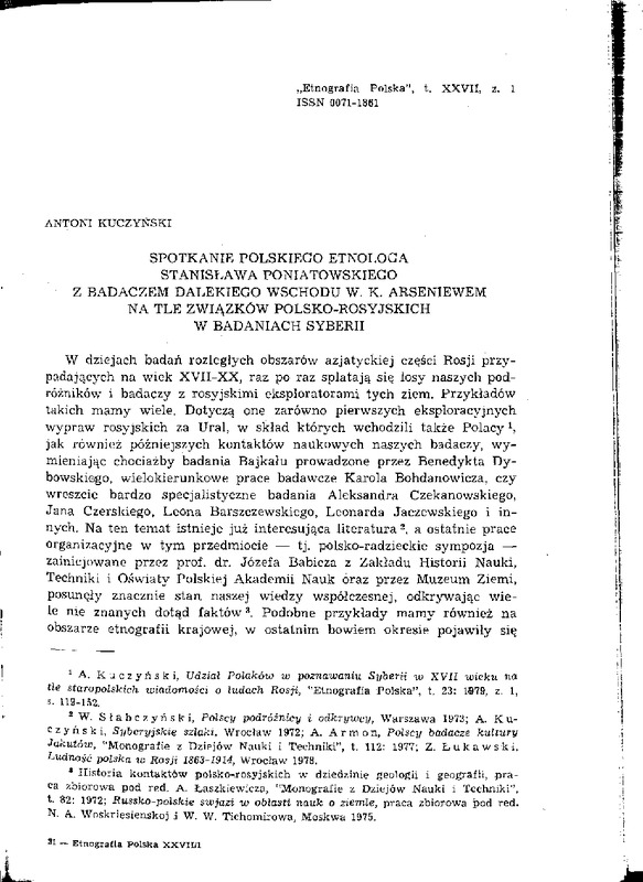 Spotkanie polskiego etnologa Stanisława Poniatowskiego z badaczem Dalekiego Wschodu W. K. Arseniewem na tle związków polsko-rosyjskich w badaniach Syberii / ETNOGRAFIA POLSKA 1983 t.27 z.1