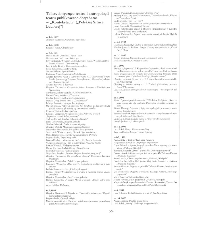 Teksty dotyczące teatru i antropologii teatru publikowane dotychczas w "Kontekstach" ("Polskiej Sztuce Ludowej") / Polska Sztuka Ludowa - Konteksty 2001 t.55 z.1-4