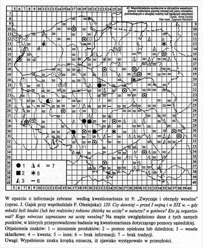 Współdziałanie społeczne w obrzędzie weselnym: pomoc materialna pannie mlodej lub panu młodemu pochodzącym z ubogiej rodziny lub będacy sierotami / Komentarze do Polskiego Atlasu Etnograficznego (mapy)
