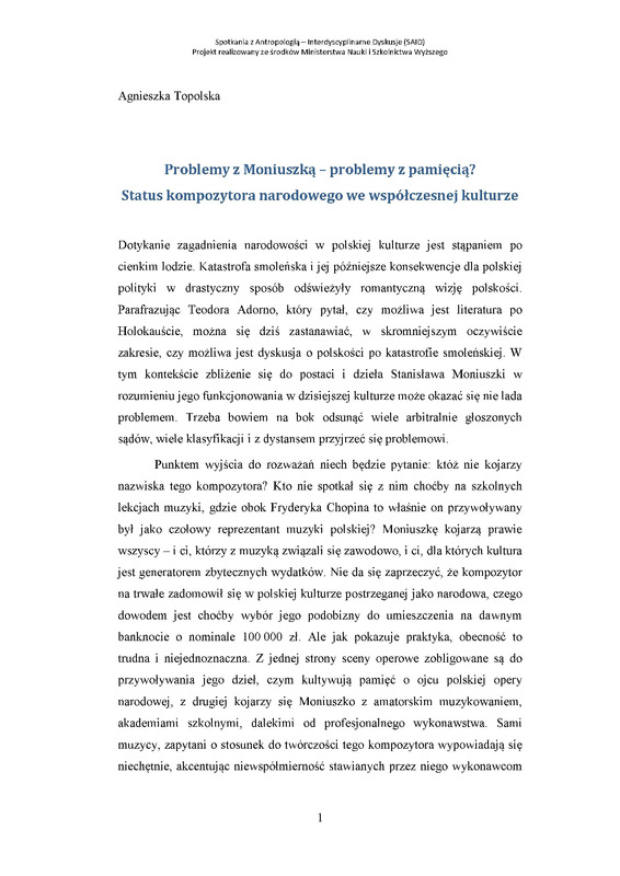 Problemy z Moniuszką - problemy z pamięcią? Status kompozytora narodowego we współczesnej kulturze / SAID