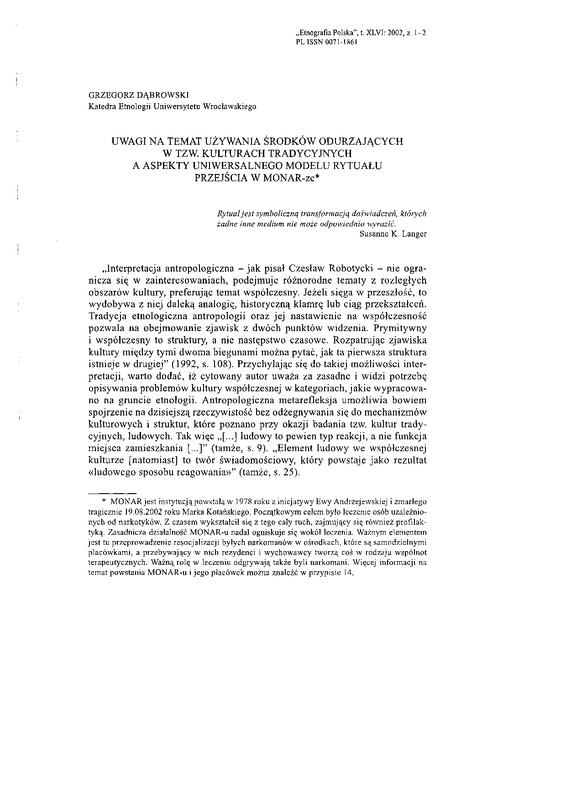 Uwagi na temat używania środków odurzających w tzw. kulturach tradycyjnych a aspekty uniwersalnego modelu rytuału przejścia w MONAR-ze / ETNOGRAFIA POLSKA 2002 t.46