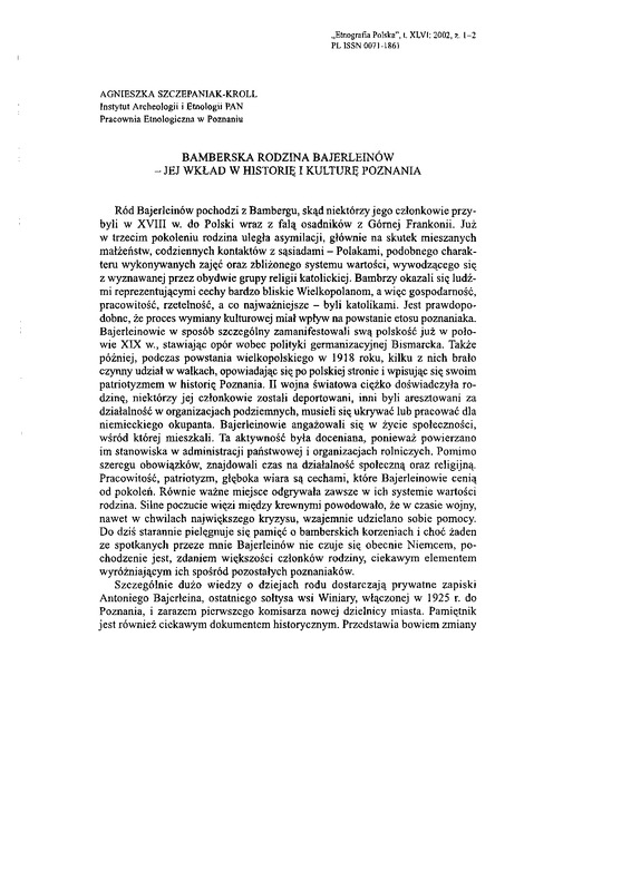 Bamberska rodzina Bajerleinów - jej wkład w historię i kulturę Poznania / ETNOGRAFIA POLSKA 2002 t.46