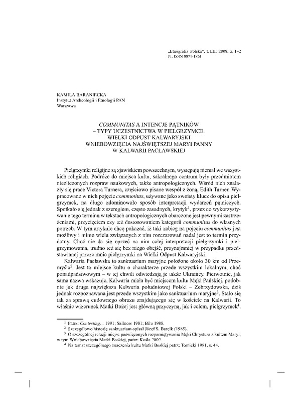 Communitas a intencje pątnikow - typy uczestnictwa w pielgrzymce / ETNOGRAFIA POLSKA 2008 t.52