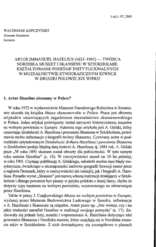 Artur Imannuel Hazelius(1833-1901) - twórca Nordiska museet i Skansenu w Sztokholmie / LUD 2003 t.87