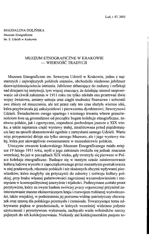 - Muzeum Etnograficzne w Krakowie - wierność tradycji / LUD 2003 t.87
